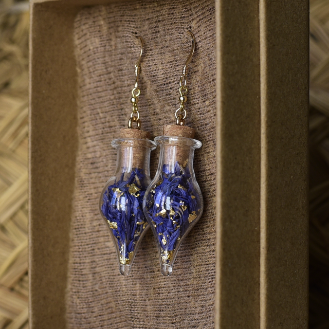 • une création unique en or recyclé (gold filled) & laiton ~ les fioles contiennent des pétales fleurs de bleuet ~ feuilles d'or