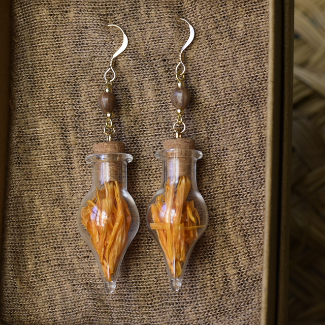 • une création unique en or recyclé (gold filled) laiton & graines de job marrons ~ les fioles contiennent des pétales de calendula