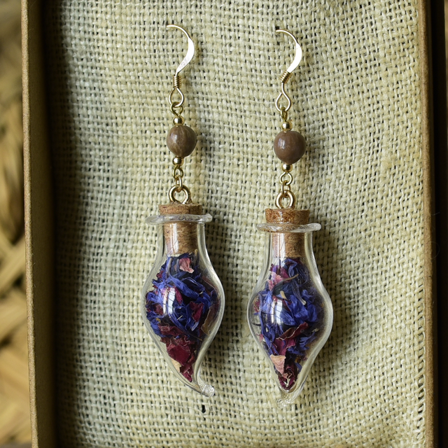 • une création unique en or recyclé (gold filled) & perles de job marrons ~ les fioles contiennent des fleurs de rose & bleuet