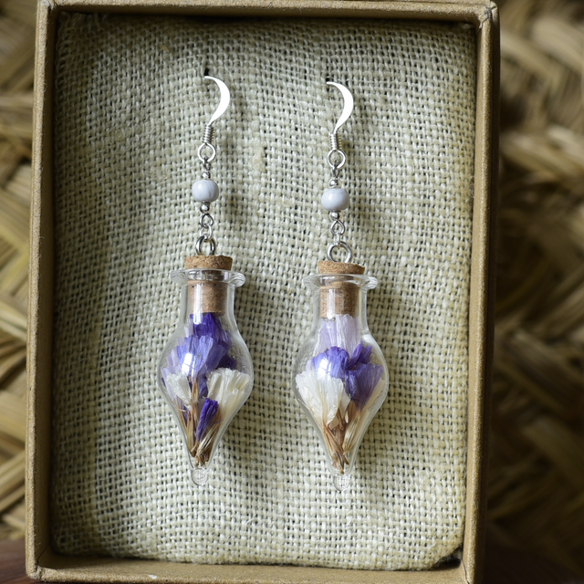 • une création unique en argent 925 et acier inoxydable, graines de job bleutées ~ les fioles contiennent des fleurs de statice