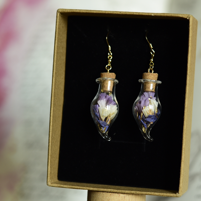 • une création unique en or recyclé (gold filled) & laiton ~ les fioles contiennent des fleurs statices violettes, blanches & bleuets ~ feuilles d'or