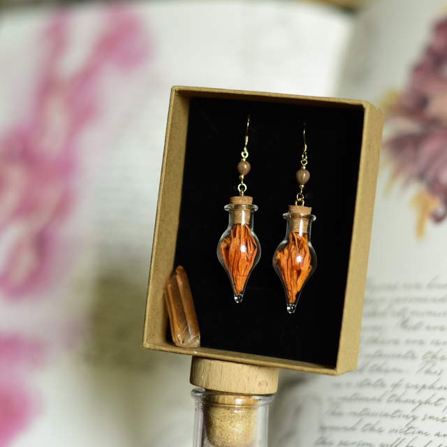 • une création unique en or recyclé (gold filled) laiton & graines de job marrons ~ les fioles contiennent des pétales de calendula