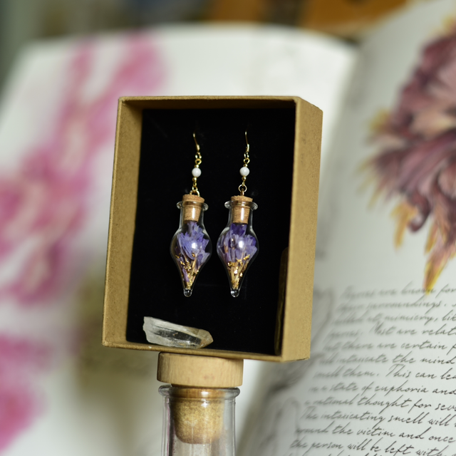 • une création unique en or recyclé (gold filled), laiton & minis perles de job bleutées ~ les fioles contiennent des fleurs statices violettes ~ feuilles d'or
