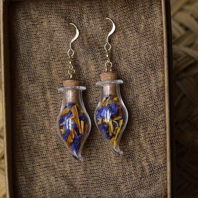 • une création unique en or recyclé (gold filled) & laiton ~ les fioles contiennent des pétales de calendula & bleuet ~ feuilles d'or