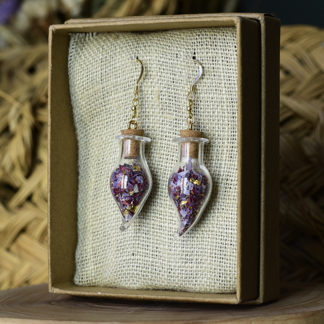 • une création unique en or recyclé (gold filled) & laiton ~ les fioles contiennent des fleurs de rose & lotus ~ feuilles d'or