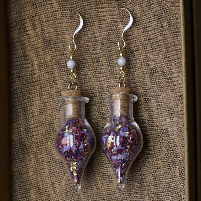 • une création unique en or recyclé (gold filled), laiton & perles de job bleutées ~ les fioles contiennent des fleurs de rose & lotus ~ feuilles d'or
