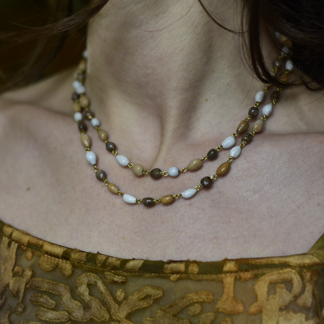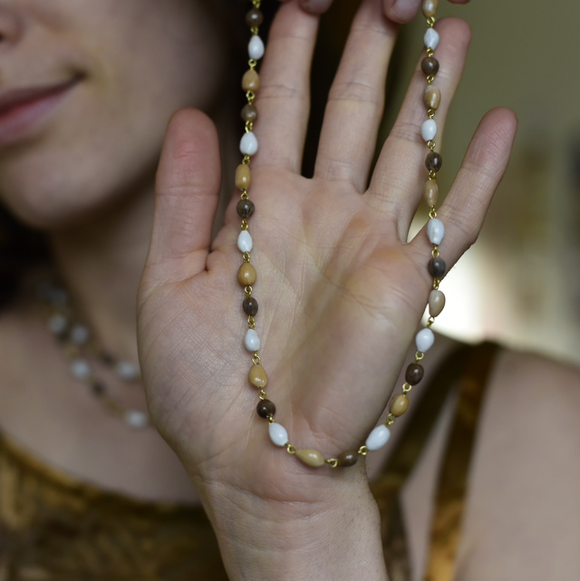 • une création unique de graines naturelles de job beiges - bleues - marrons, réglable avec un fermoir en laiton