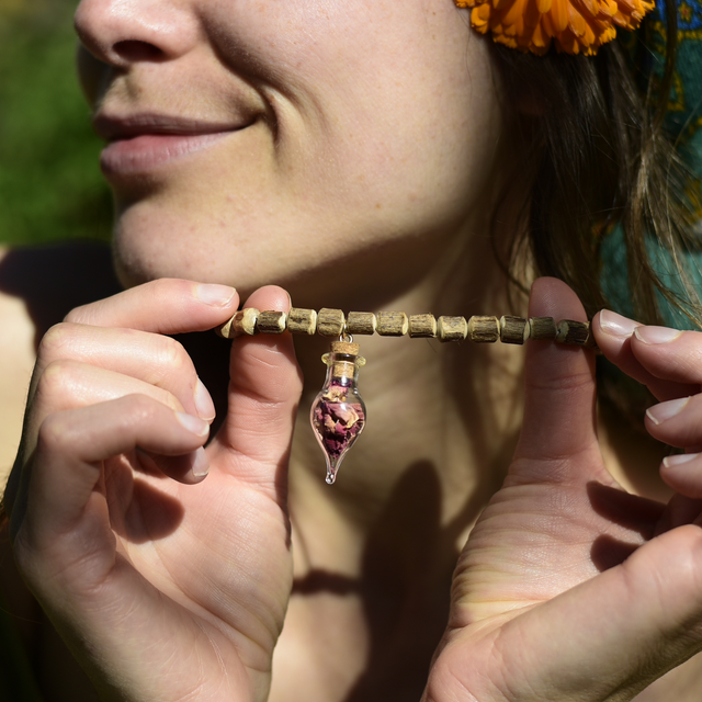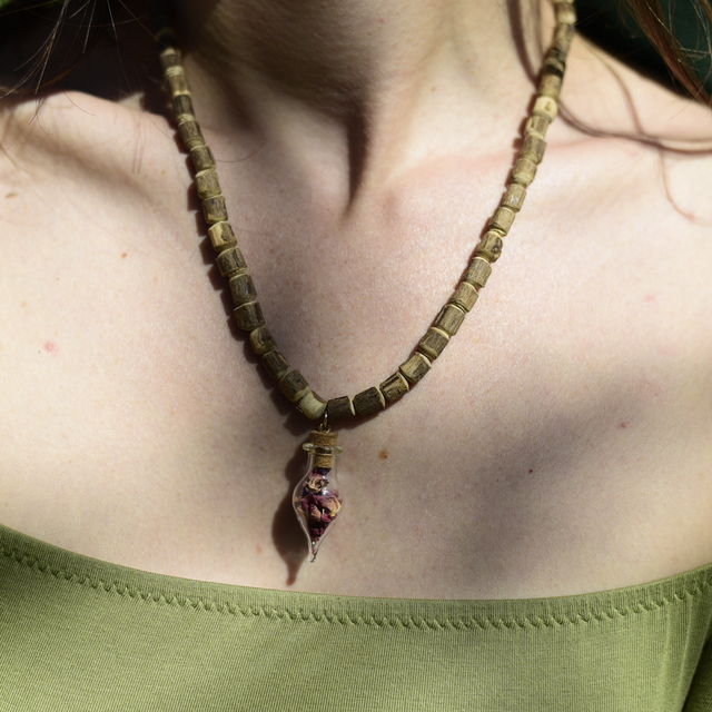 • collier en bois brut de tulsi indien, sur fil de lin ciré avec une fiole de pétales de rose (rosa damascena)