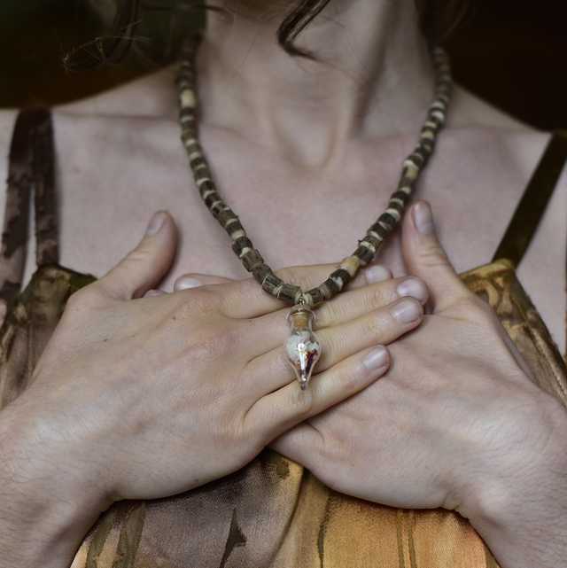 • collier en bois brut de tulsi indien, sur fil de lin ciré avec une fiole ambrée de pétales rose, fleurs de statice, feuilles d'or