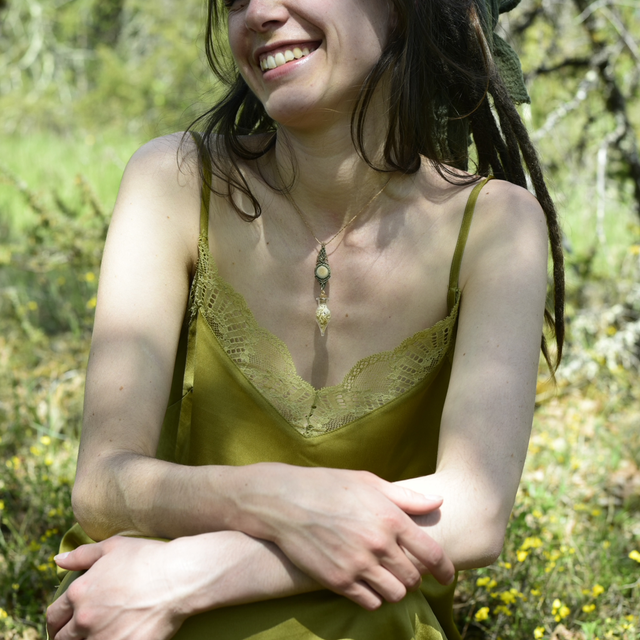 • une création unique en tressage macramé Linhasita accompagnée d’une graine de tagua polie ~ perle gold filled (or recyclé) ~ fiole de pétales de camomille romaine