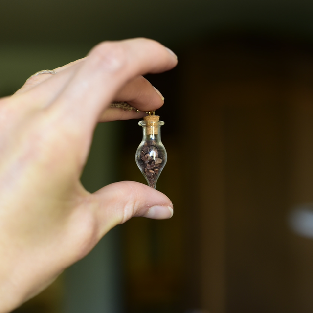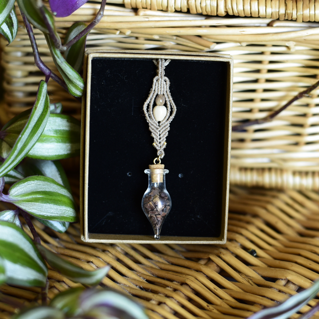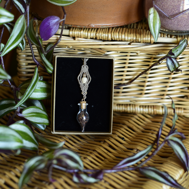 • une création unique en tressage macramé Linhasita accompagnée de graines de job ~ gold filled (or recyclé) ~ fiole de grains de cacao concassés