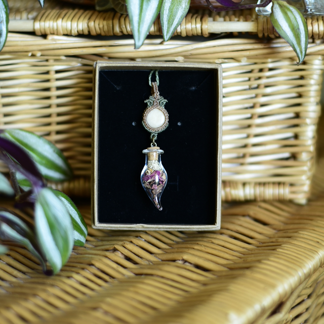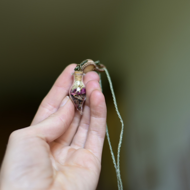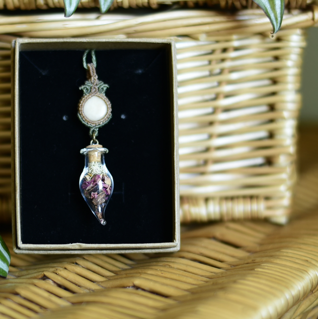 • une création unique en tressage macramé Linhasita accompagnée d'une graine de tagua polie ~ graine de job beige ~ fiole de cacao, rose & lichen