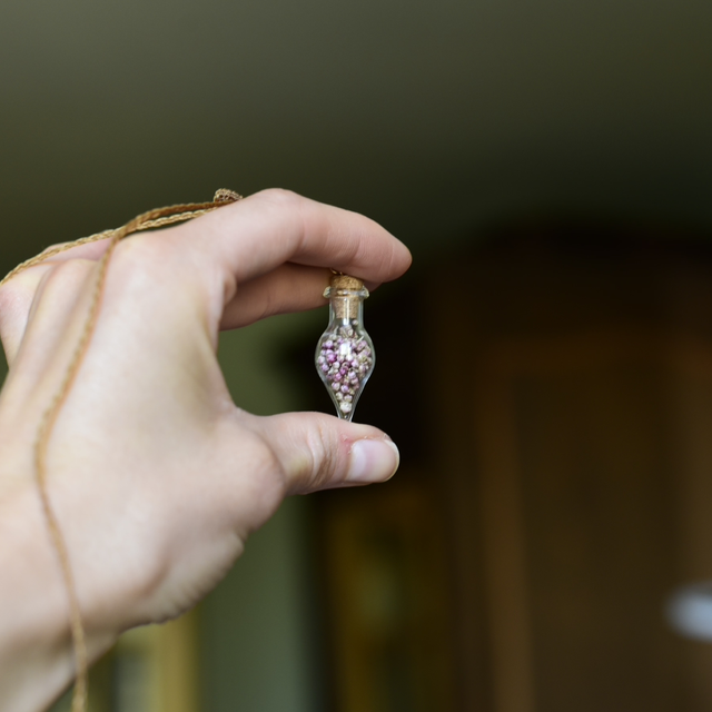 • une création unique en tressage macramé Linhasita accompagnée d'une graine de tagua polie ~ gold filled (or recyclé) ~ fiole d'une fleur mystérieuse