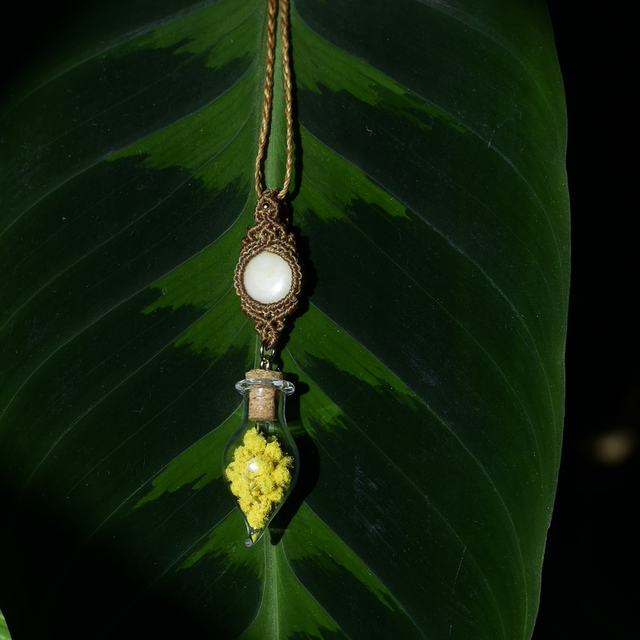 • une création unique en tressage macramé Linhasita ~ gold filled (or recyclé) ~ fiole de fleurs de mimosa